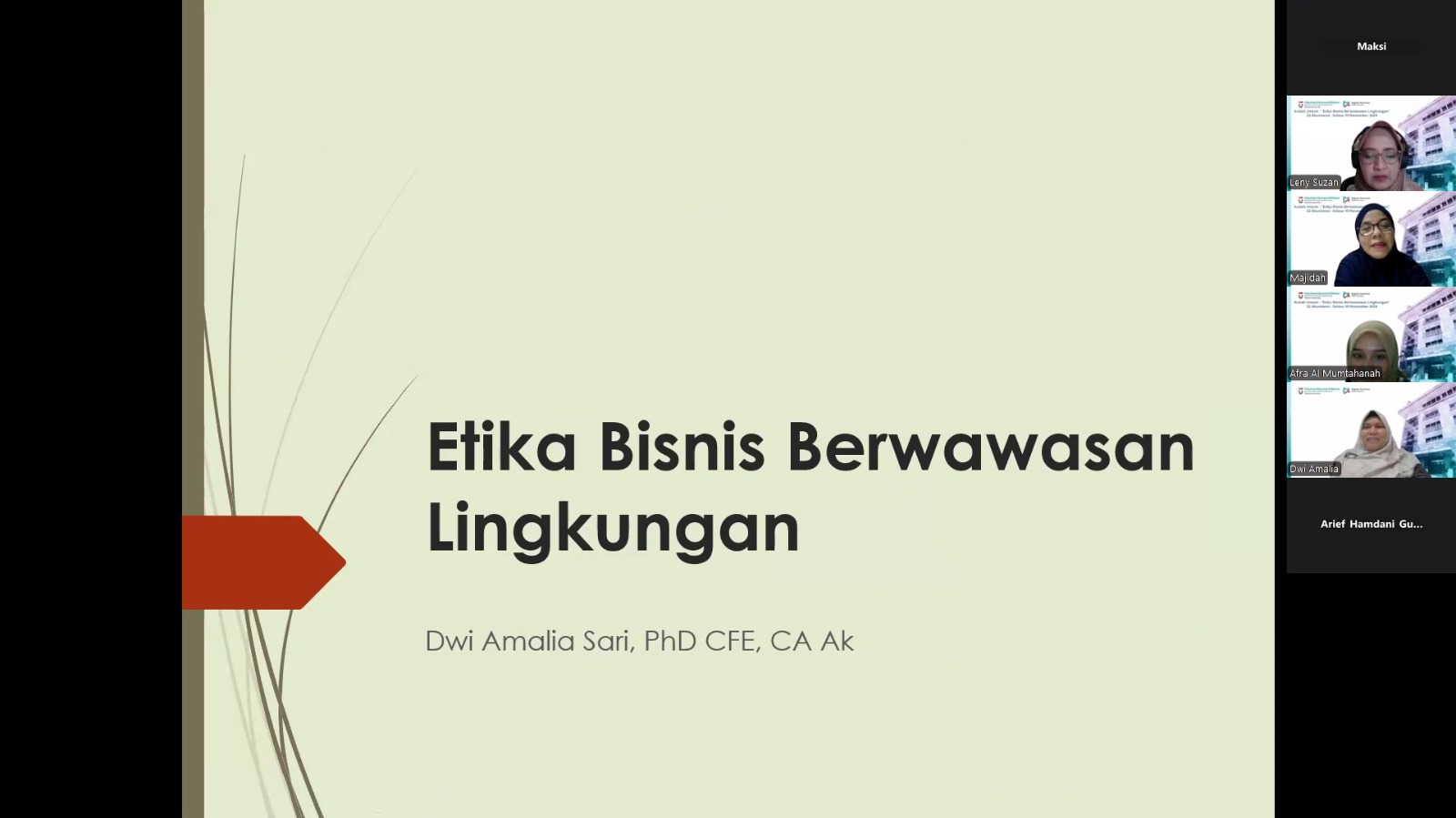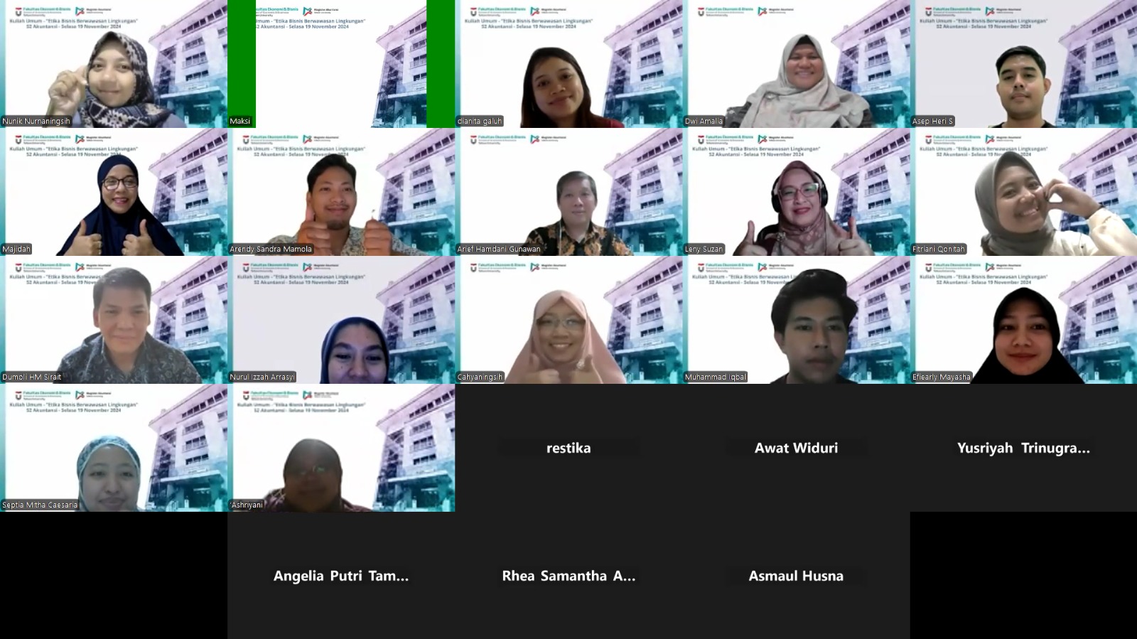 Pada hari Selasa, 20 November 2024. Prodi S2 Magister Akuntansi telah melaksanakan Kuliah Umum bersama Narasumber yaitu Ibu Dwi Amalia Sari,SE,MBA.MFA.PhD,CFE.CA,Ak , BPK Directorate General of Audit IV dengan topik “Etika Bisnis Berwawasan lingkungan” melalui zoom meeting.